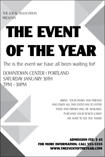 Bring your event into sharp focus—add the All Purpose Triangles Black and White Poster to your event marketing plan. Tonal, gray triads point out function information, which is presented in standout typeface. Tailor to your needs in minutes—we’ll custom print and ship.